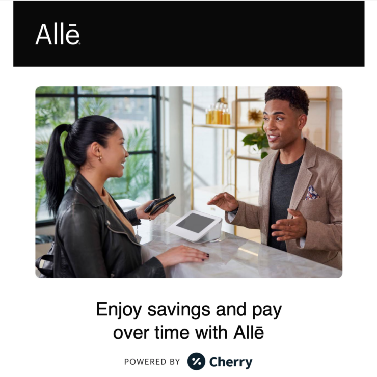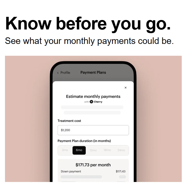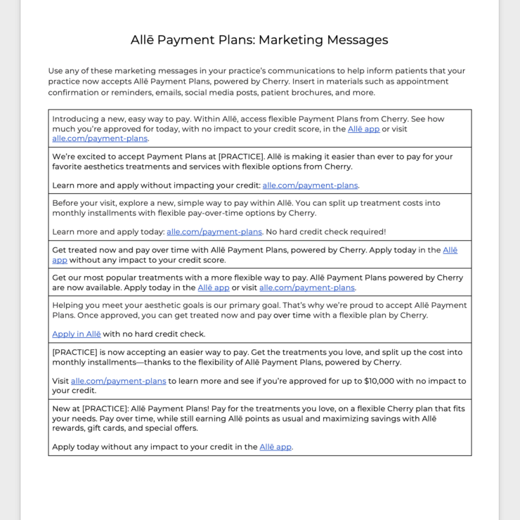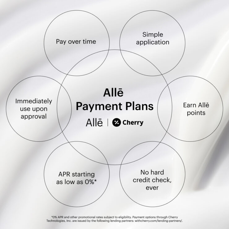 Allē Payment Plans offer patients the flexibility of paying for their favorite aesthetic treatments over time—with timely payouts for your practice, powered by Cherry.