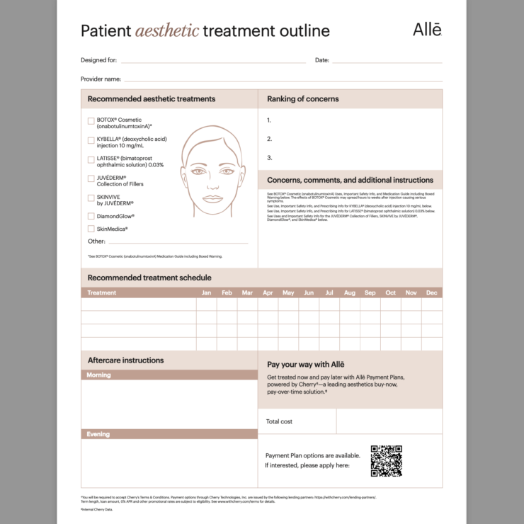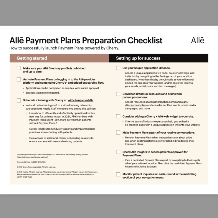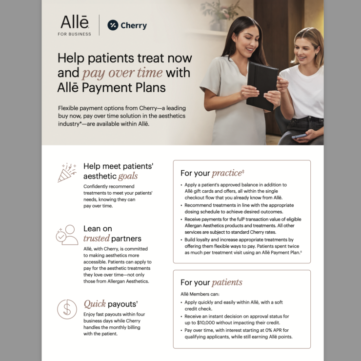 If you’re interested in accepting Allē Payment Plans at your practice, reach out to your Allergan Aesthetics representative.