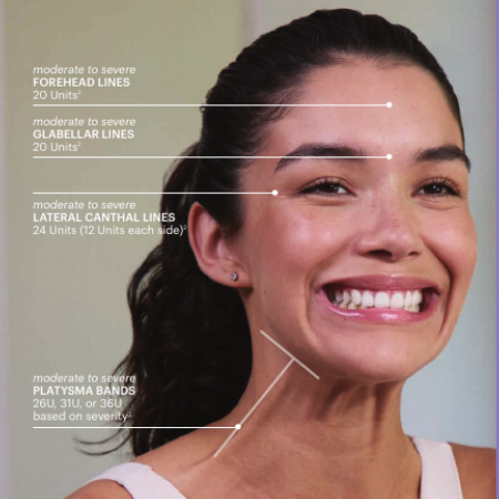 The original prescription treatment FDA approved to temporarily improve the look of moderate to severe frown lines, crow’s feet lines, forehead lines, and vertical bands connecting the neck and jaw (platysma bands) in adults.